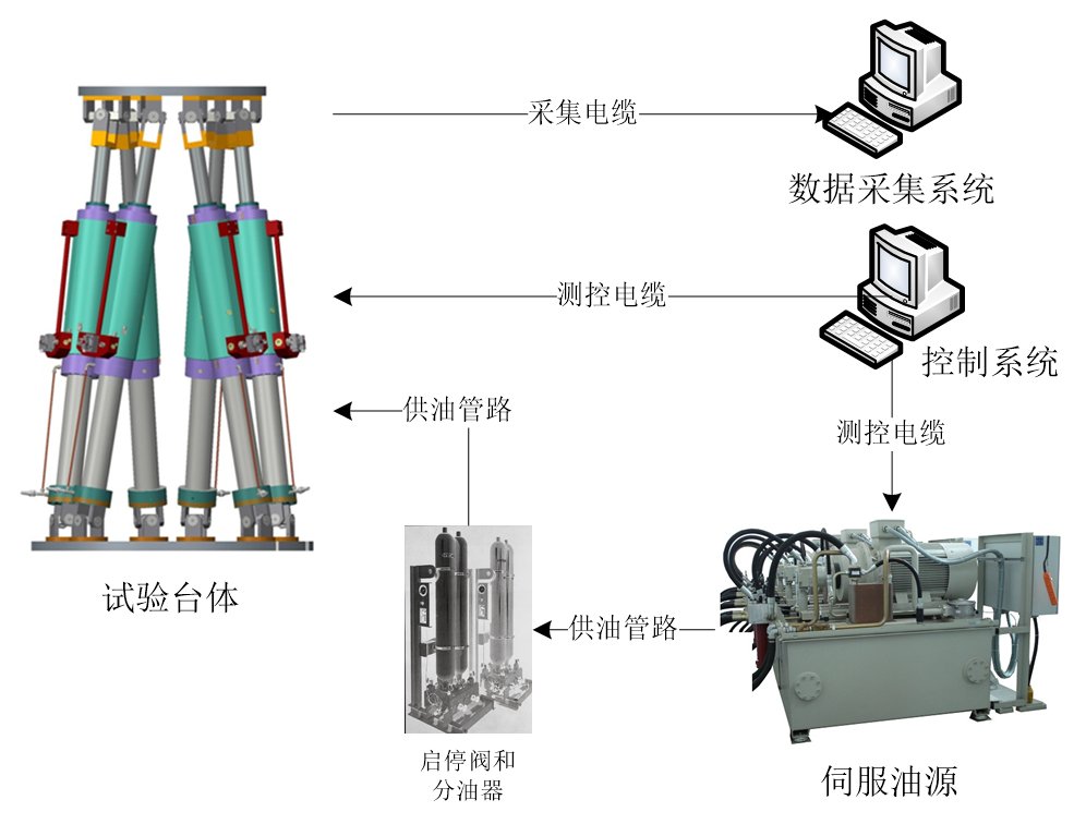 液壓搖擺臺由試驗臺體、控制系統(tǒng)、伺服油源、子站和數(shù)據(jù)采集系統(tǒng)等主要部分組成。其中,試驗臺體是由6臺作動器組成的六自由度運動平臺,用于實現(xiàn)試驗件的單自由度正弦運動或多自由度復(fù)合正弦運動。控制系統(tǒng)控制試驗臺體或者單個作動器按指令運動。伺服油源為系統(tǒng)運動提供動力。啟停閥用于控制伺服油源動力的通斷。分油器將油液輸送到試驗臺體的各執(zhí)行機構(gòu)中。數(shù)據(jù)采集系統(tǒng)采集存儲試驗數(shù)據(jù)。