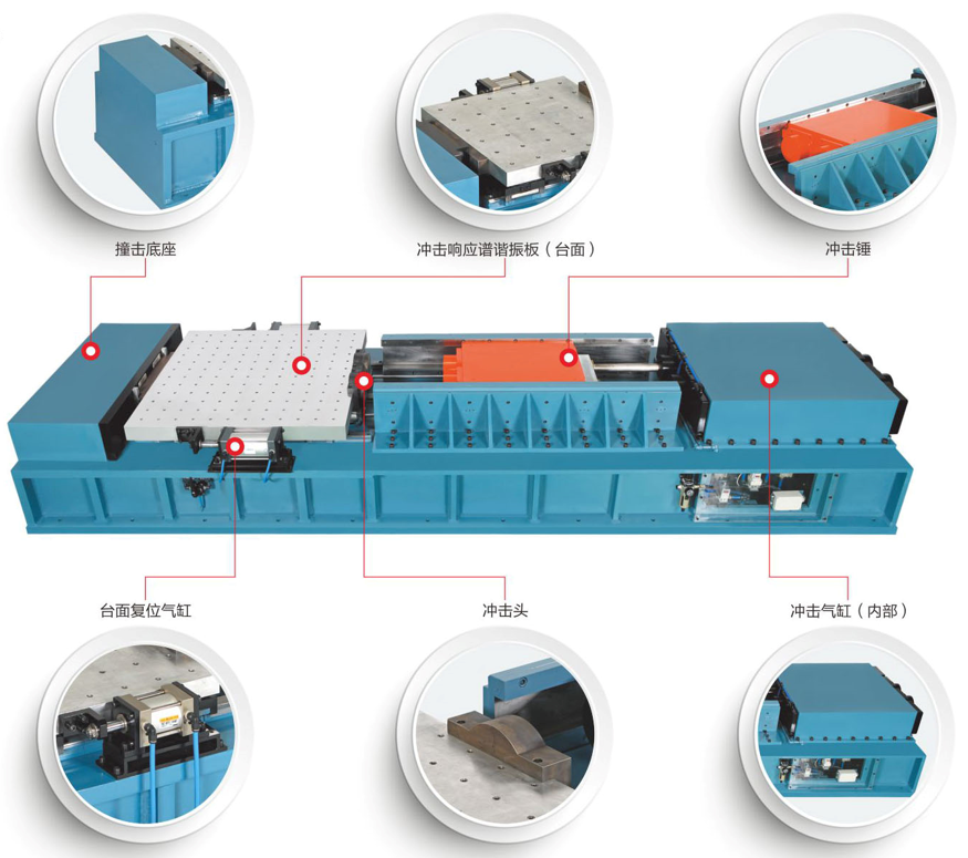 • 沖擊錘通過水平導(dǎo)軌安裝在水平?jīng)_擊面上,經(jīng)沖擊氣缸推動(dòng),高速撞擊沖擊響應(yīng)譜諧振板,并通過復(fù)位氣缸進(jìn)行復(fù)位操作。